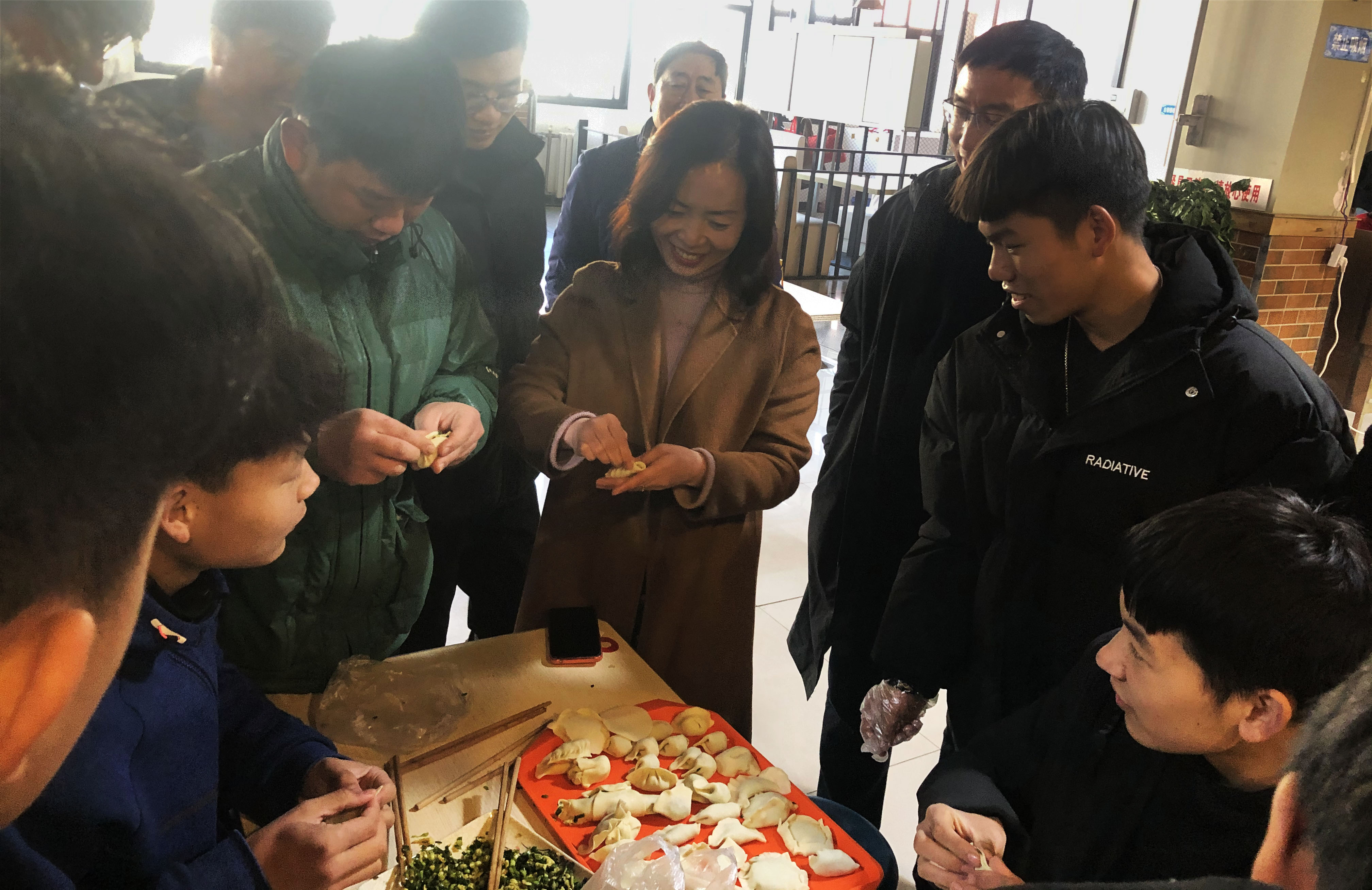 教务处领导也到现场与同学们一起感受节日氛围,陈宝利处长和同学们进行亲切交流,郭翠娟副处长发现个别学生属于包饺子的新手,现场进行手把手指点。