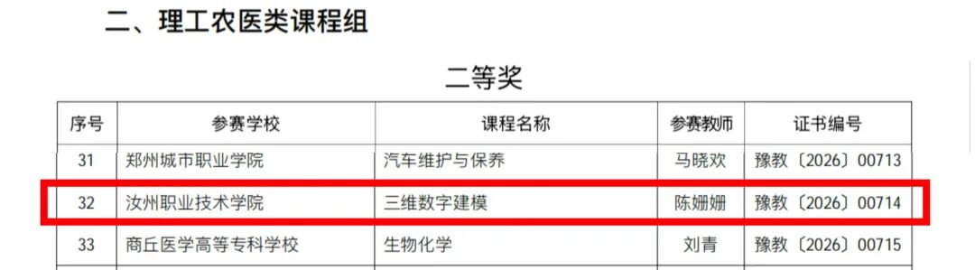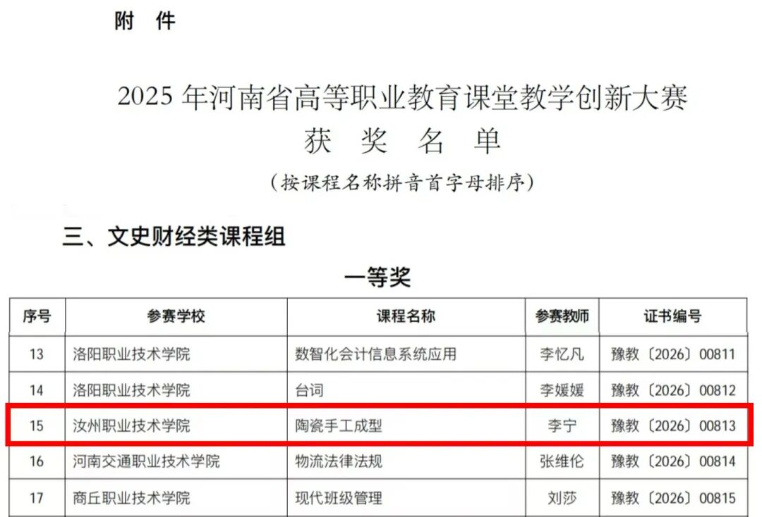 近日,河南省教育厅正式公布《2025年河南省高等职业教育课堂教学创新大赛获奖名单》,我校教师喜获一等奖1项、二等奖2项。